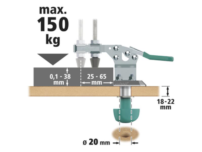 Mobilný rýchloupínač z ocele je ideálny na všetky projekty, pri ktorých chcete obrobky bezpečne upnúť a opracovať. Vo všetkých stoloch s 20 mm otvormi sa dá v priebehu niekoľkých sekúnd aretovať pomocou dosky adaptéra z hliníkového tlakového odliatku. Jednoducho ho zasuňte a utiahnite skrutku s maticou pod pracovnou doskou. Vďaka ergonomickej rukoväti sa vám to podarí rýchlo, bezpečne a pohodlne. Ak použijete upevnenie takýmto spôsobom, môžete vyvinúť upínaciu silu až 150 kg. Mobilný rýchloupínač je ideálny pre sériové práce. Ako alternatívu môžete odstrániť dosku adaptéra a pomocou štyroch skrutiek trvalo priskrutkovať mobilný rýchloupínač priamo na pracovnú dosku. Šírku upnutia od 0 do 38 mm je možné pomocou závitového vretena flexibilne prispôsobiť vašim obrobkom. S rozsahom vyloženia 25 až 65 mm je ideálny na flexibilné použitie pri rozmanitých upínacích úlohách. Obsluha sa vykonáva pomocou upínacej páky, ktorá je opláštená gumovým poťahom bez obsahu PVC na optimálne uchopenie. Prítlačný tŕň pozostáva z vysokokvalitného NBR na upínanie šetrné voči povrchu a protišmykové upevnenie obrobku.